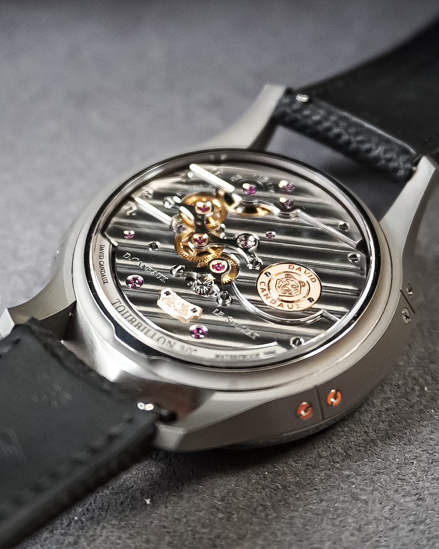 • Case : Bassinet-shaped asymmetrical case in grade 5 natural titanium, titanium finish satin-finished and hand-polished